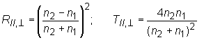 Отражательная способность границы раздела сред для лучей с параллельной и перпендикулярной поляризацией R|| и R^, а также пропускательная способность границы сред T|| и T^ описывается выражениями: