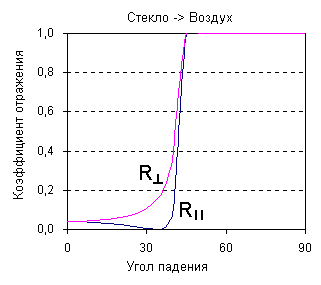 На рисунках ниже показан график зависимости отражательной и пропускательной способности границы раздела сред R и T от угла падения: