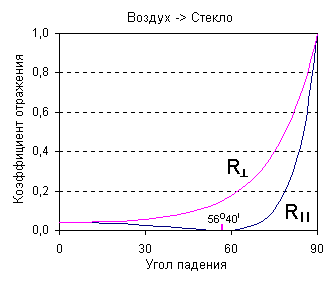 Из графиков также видно, что для света, распространяющегося из воздуха в стекло, имеется угол qBR, при котором составляющая с параллельной поляризацией не будет отражаться от границы раздела сред, в то врем как интенсивность отражённого света с перпендикулярной поляризацией отлична от нуля. Этот угол называется углом Брюстера. Величина угла Брюстера для границы раздела воздух-стекло составляет величину, равную примерно 56°40' . Этот эффект используется в лазерах, а также для создания оптических поляризаторов.
