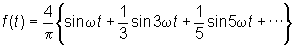 f(t)=1.273*sin(1*w*t)+0.424*sin(3*w*t)+0.255*sin(5*w*t)+0.182*sin(7*w*t)+0.141*sin(9*w*t)+0.116*sin(11*w*t)+0.098*sin(13*w*t)+0.085*sin(15*w*t)+0.075*sin(17*w*t)+0.067*sin(19*w*t)+0.060*sin(21*w*t)+0.055*sin(23*w*t)+0.051*sin(25*w*t)+0.047*sin(27*w*t)+0.044*sin(29*w*t)+0.041*sin(31*w*t)+0.039*sin(33*w*t)+0.036*sin(35*w*t)+0.034*sin(37*w*t)+0.033*sin(39*w*t) |